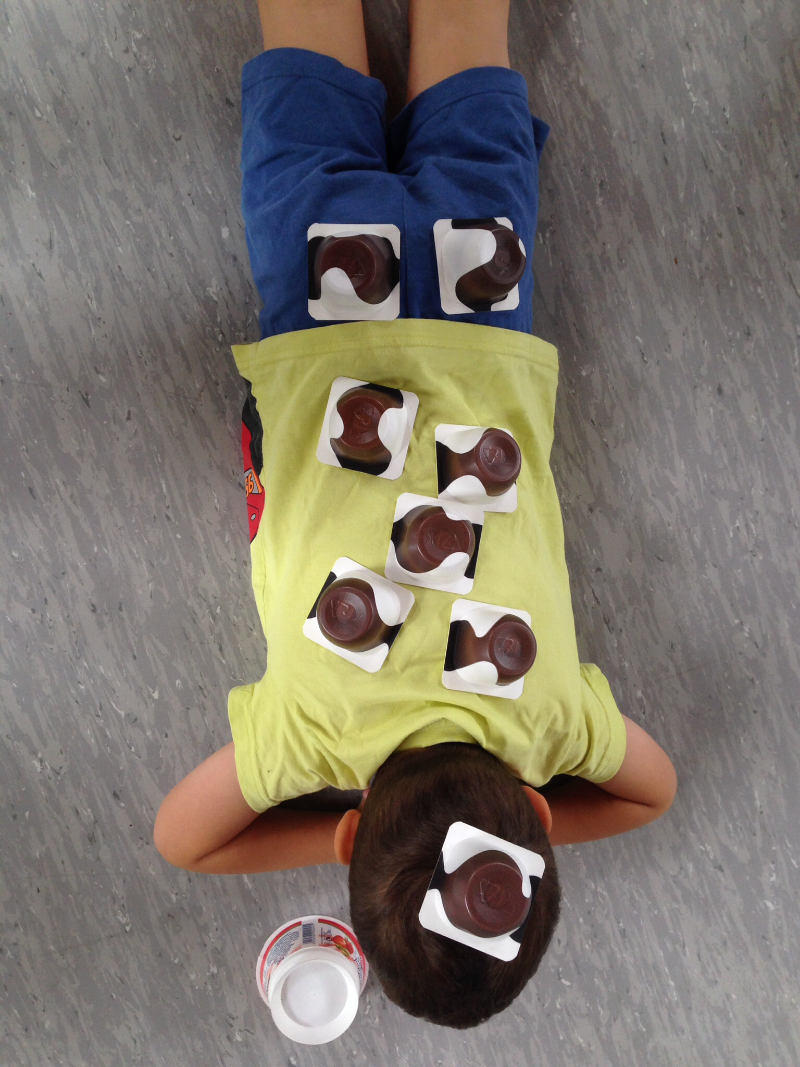 Langsam und vorsichtig verteilt er nun einige Jogurtbecher so auf dem Rücken, Beinen, Armen oder Kopf, dass sie nicht herunter fallen.