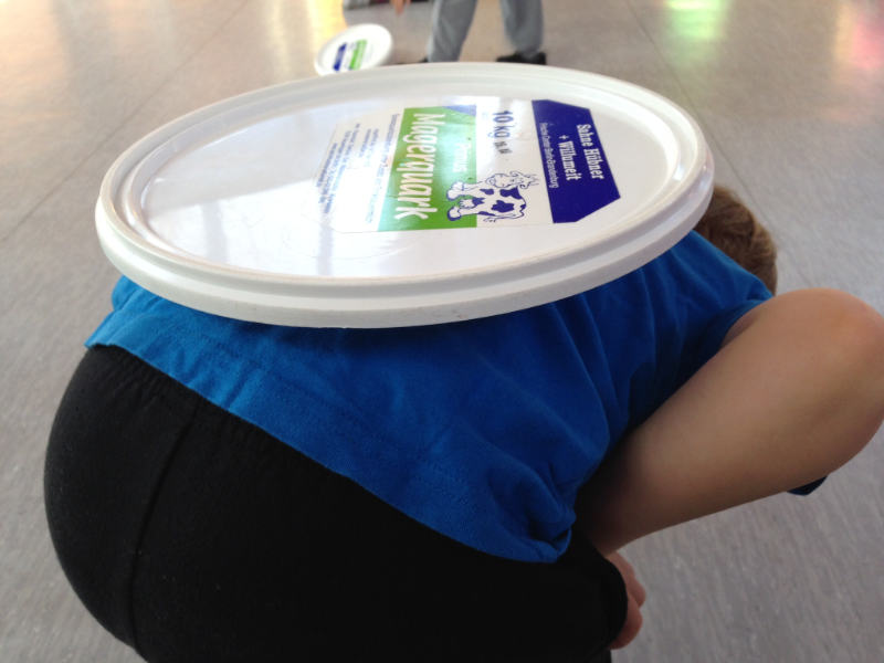 Schulung des mathematischen Grundwissens in Bewegung. Die Farbspiele mit Eimerdeckeln setzten bekannte Sortier- und Memoryspielideen im Raum um. Durch die veränderte Perspektive für die kinder ein vollkommen neues Spiel.