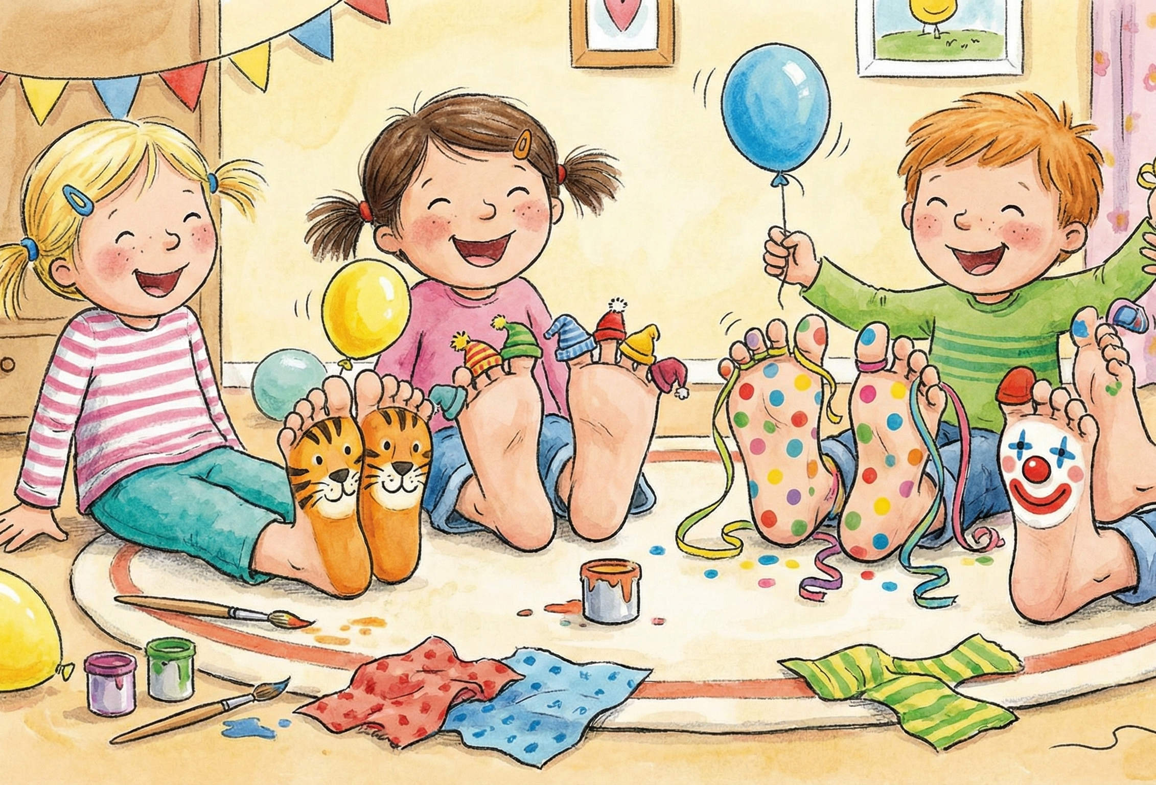 Warum sollen an Karneval eigentlich immer nur die Gesichter geschminkt werden? Bei unserer Aktion „Fasching für die Füße“ drehen wir den Spieß um! Mit etwas Fantasie und Farbe verwandeln sich Kinderfüße in lustige Clowns, wilde Tiere oder bunte Fabelwesen.