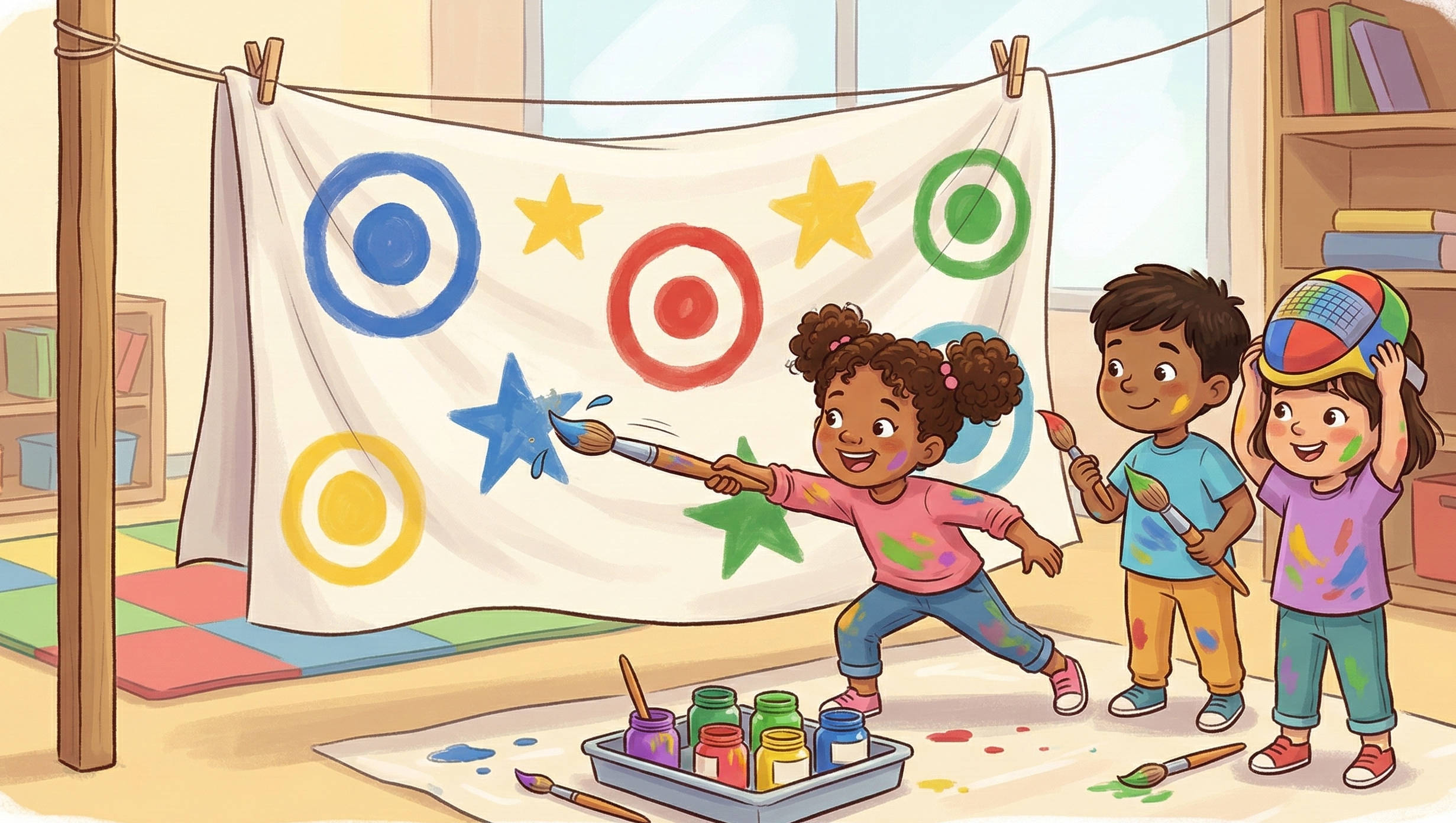 Ein Pinsel ist kein Spielzeugdegen. Achten Sie darauf, dass die Kinder nur auf das Tuch zielen und nicht auf andere Kinder oder Gegenstände.