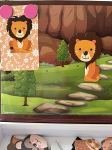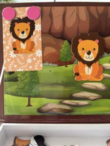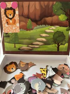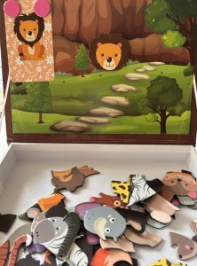 Das Kind hat nun die Möglichkeit eine der Spielkarten an dem magnetischen Deckel zu befestigen. Nun sucht es die passenden Puzzelteil heraus, um das dargestellte Tier zu puzzlen.