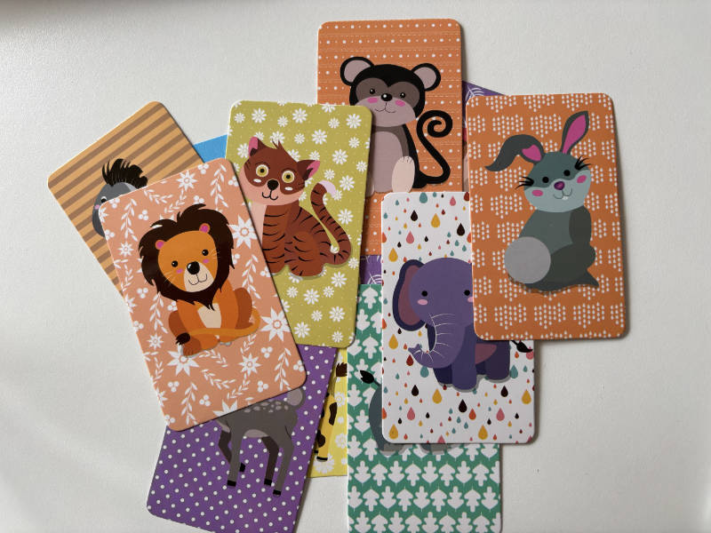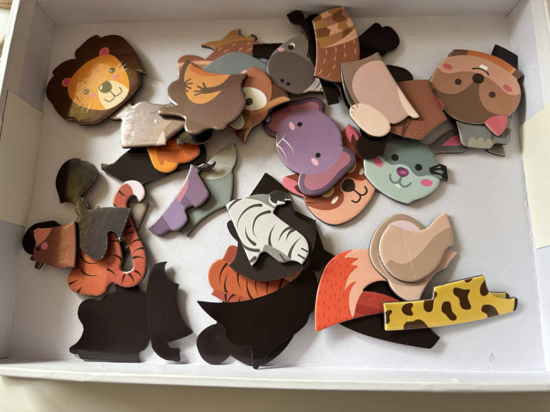 In der Box liegen 45 magnetische Puzzelteile und 14 Spielkarten, auf den verschiedene Tiere abgebildet sind.