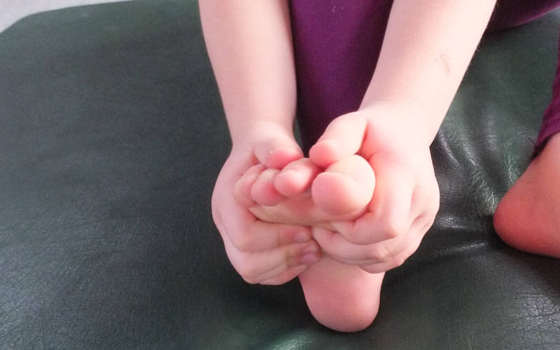 Die Hände aneinanderreiben, bis sie warm sind. Dann die warmen Hände sanft um einen Fuß legen und ihn für einen Moment ganz ruhig halten.